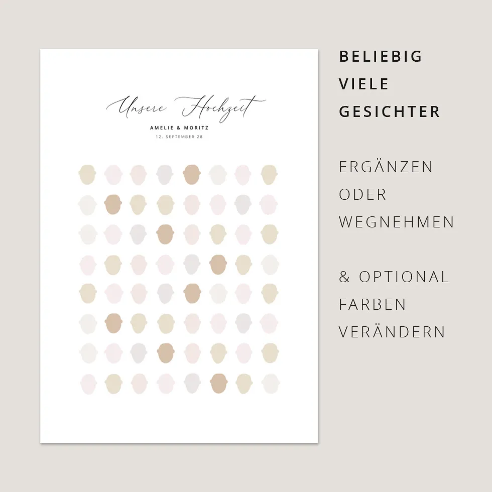 Im Konfigurator ergänzt ihr beliebig viele Gäste-Köpfe und passt Schriften, Farben & Elemente völlig frei nach euren Wünschen an.