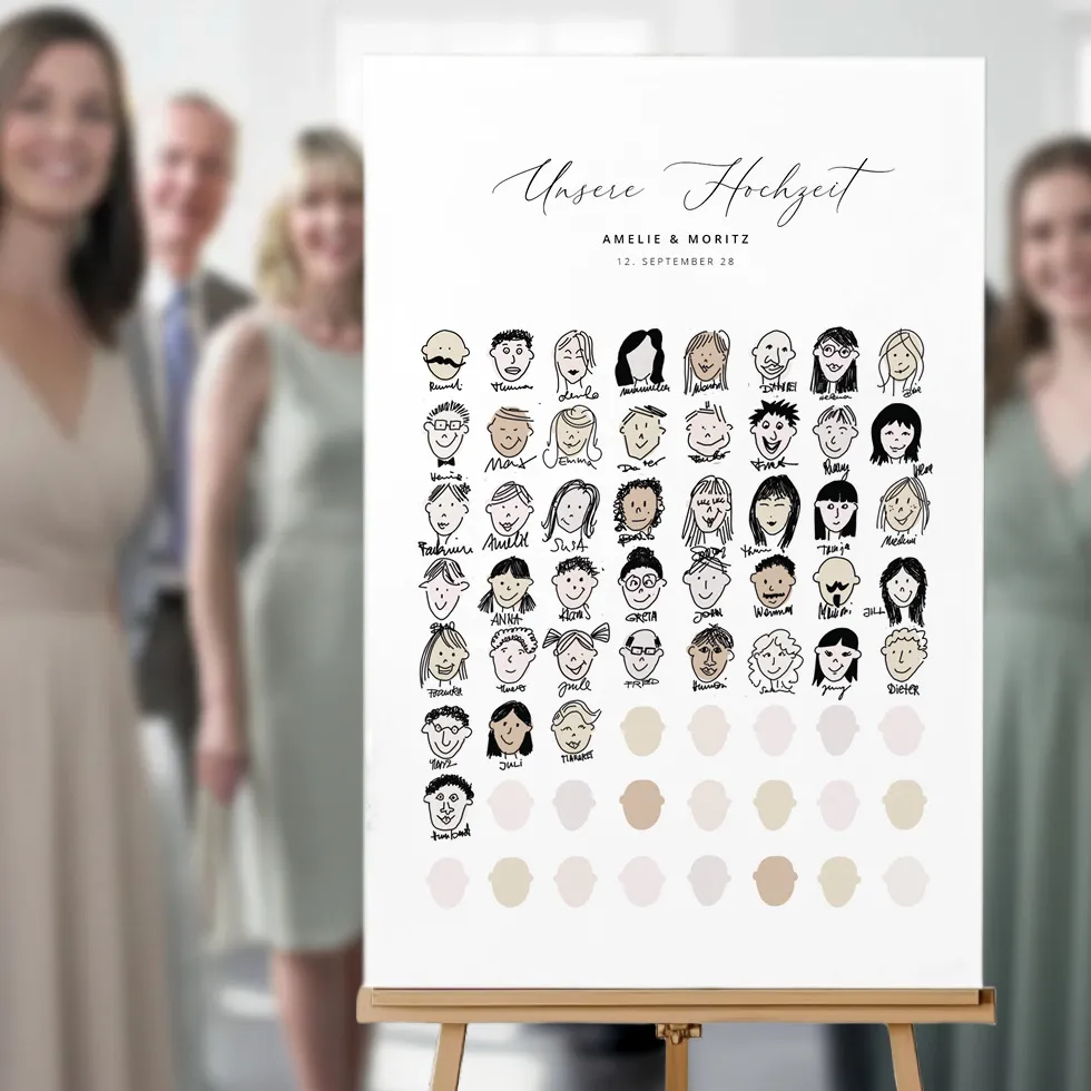 Euer Gästebuch als Bild, das alle mitreißt: Gäste zeichnen kleine Gesichter – und mit jeder Zeichnung wächst euer Unikat. Dank unserer Vorlagen klappt’s auch für Zeichenmuffel mit dezent vorgezeichnete Umrisse in Grau als Orientierung – und genug Freiheit für die eigene Zeichnung.