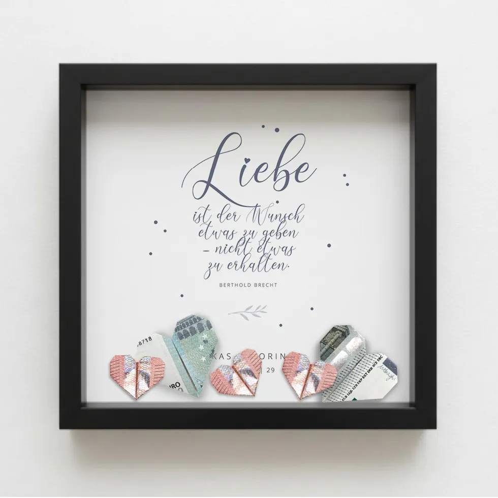 Überreicht dem Brautpaar euer Geldgeschenk hübsch verpackt im 3-D-Bilderrahmen. Das Motiv bleibt auch nach der Geldentnahme schön. Alternativ kann der Rahmen später für das Hochzeitsfoto ergänzt durch kleine Erinnerungsstücke genutzt werden.