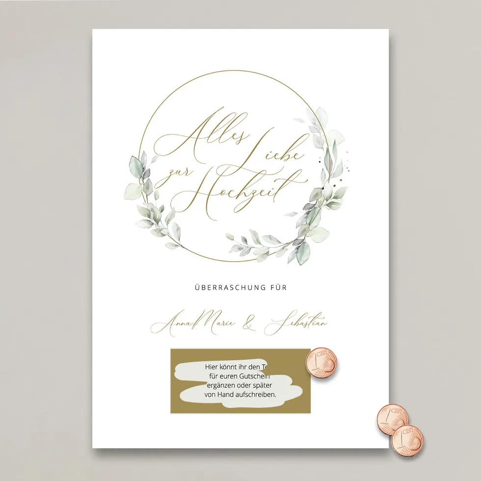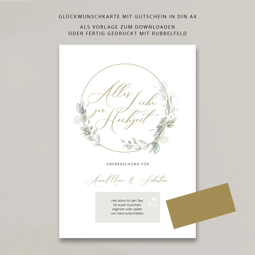 - Gutschein gedruckt auf 300 g hochweißes, elegantes Naturpapier inklusive goldenem Rubbelaufkleber