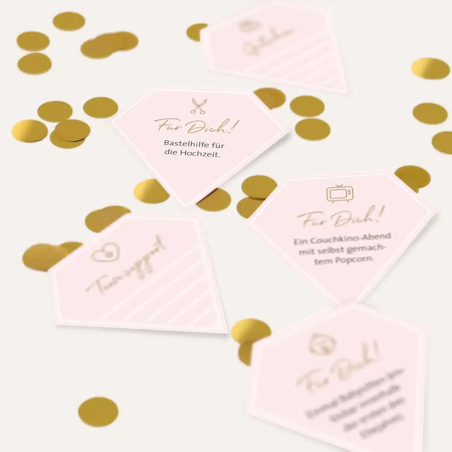 Immer wenn die Braut eine Aufgabe erfüllt hat, erhält sie von ihrem Team Belohnungs-Diamanten mit tollen Gutscheinen für die verbleibende Hochzeits-Planungszeit oder die ersten Ehe-Jahre als Team-Treffen.