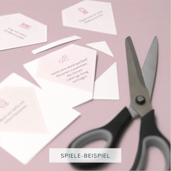 Das Belohnungskärtchen "eine Belohnung aus der Team-Braut-Schatzkiste" könnt ihr auch mehrfach nutzen. Erstellt dafür eine JGA Schatzkiste und füllt sie mit verschiedensten Kleinigkeiten, wie zum Beispiel tolle Seife, Nagellack, kleine Likörflaschen oder etwas, das zu eurem Motto passt.