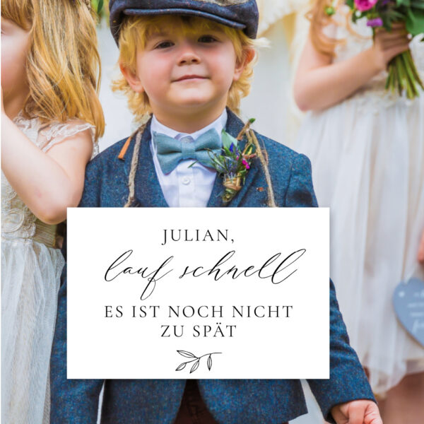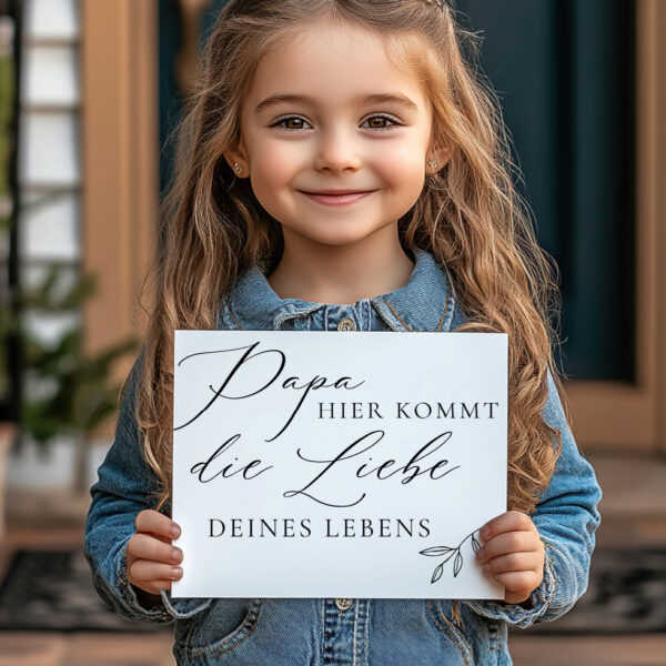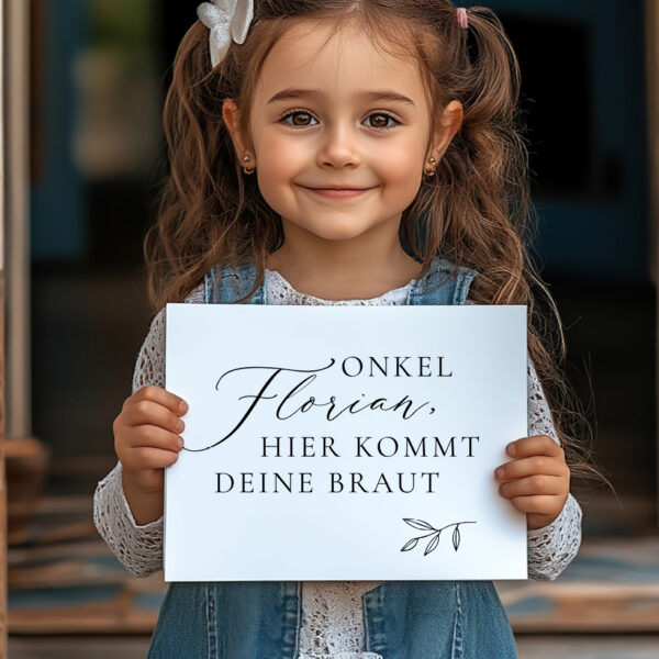 Macht den Moment des Einzugs besonders und lasst das Blumenkind mit einem hübschen „Hier kommt die Braut Schild“ einziehen.