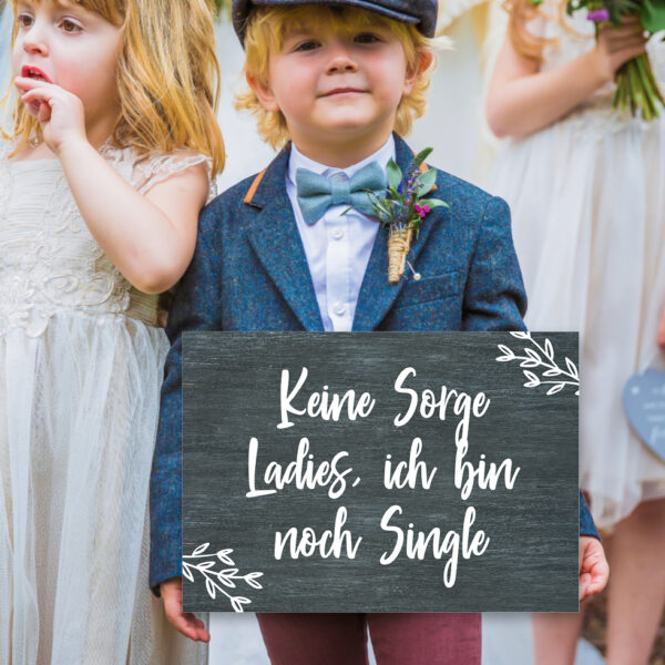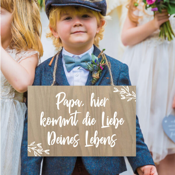 Macht den Moment des Einzugs besonders und lasst das Blumenkind mit einem hübschen „Hier kommt die Braut Schild“ einziehen.