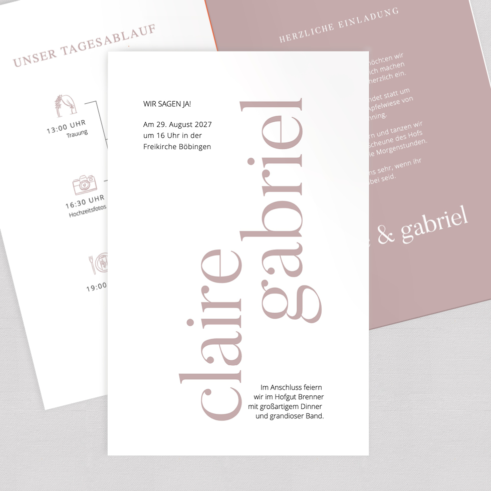 Gestaltet eure Hochzeitseinladung absolut individuell und verändert Schrift, Farben, Hintergrund völlig individuell oder ergänzt weitere Elemente sowie Fotos.
