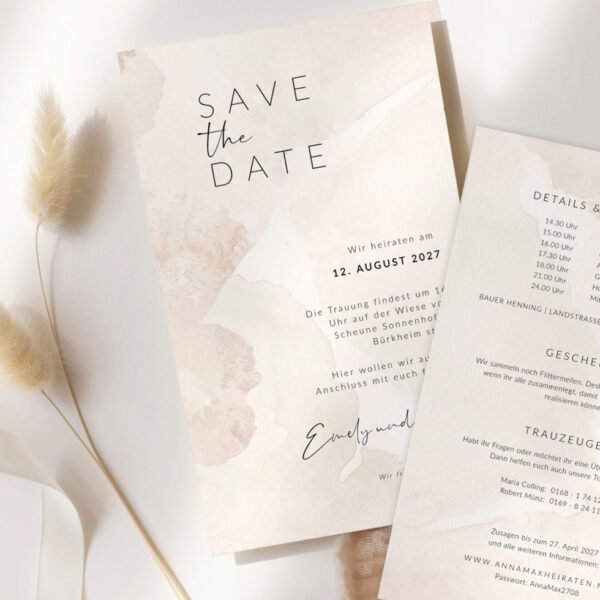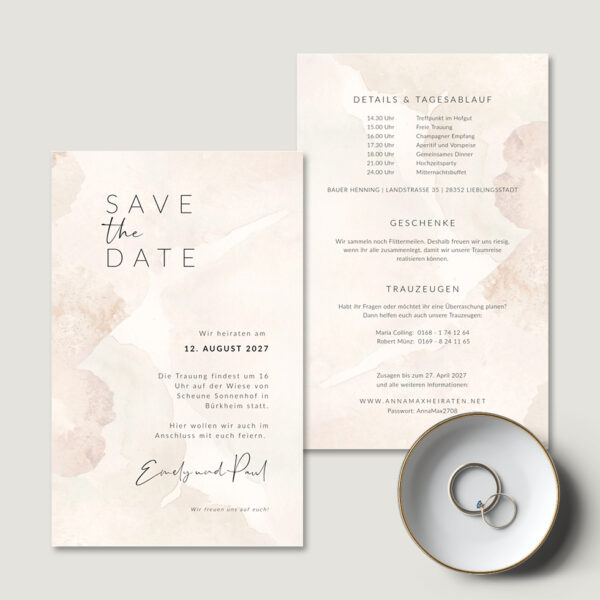 Gestaltet eure Hochzeitseinladung absolut individuell und verändert Schrift, Farben, Hintergrund völlig individuell oder ergänzt weitere Elemente sowie Fotos.