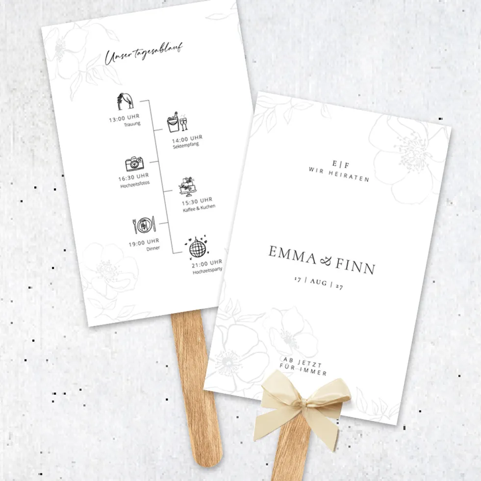Der Clou: Ihr könnt sie als praktisches Accessoire nutzen und darauf zusätzlich den Ablauf der Trauung, den Tagesablauf, einen QR-Code zum Sammeln eurer Hochzeitsfotos oder witzige Spiele ergänzen. Damit habt ihr einen tollen Doppelnutzen.