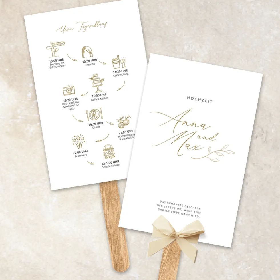 Der Clou: Ihr könnt sie als praktisches Accessoire nutzen und darauf zusätzlich den Ablauf der Trauung, den Tagesablauf, einen QR-Code zum Sammeln eurer Hochzeitsfotos oder witzige Spiele ergänzen. Damit habt ihr einen tollen Doppelnutzen.