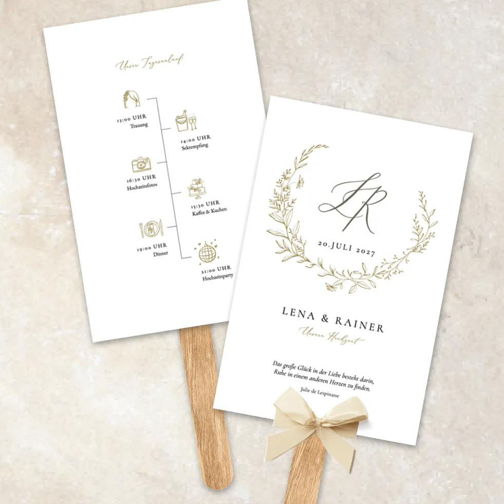 Der Clou: Ihr könnt sie als praktisches Accessoire nutzen und darauf zusätzlich den Ablauf der Trauung, den Tagesablauf, einen QR-Code zum Sammeln eurer Hochzeitsfotos oder witzige Spiele ergänzen. Damit habt ihr einen tollen Doppelnutzen.