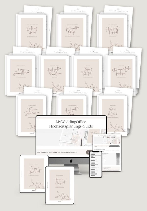 Der myWeddingOffice Hochzeitsplaner als PDF zum Downloaden ist mehr als ein einfacher Hochzeits-Guide. Denn er begleitet euch bei allen Details, die bei einer Hochzeit zu planen sind wie ein echter Weddingplanner.