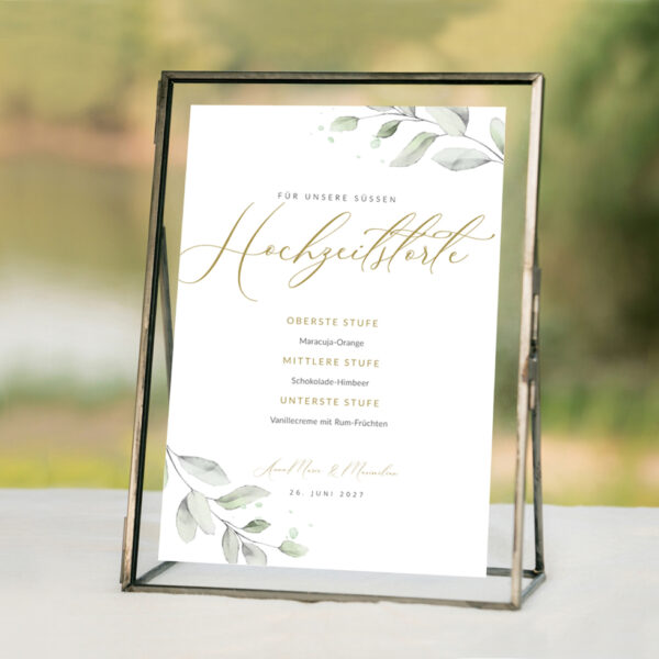„Hochzeitstorte“ Schild mit Infos – Eukalyptus