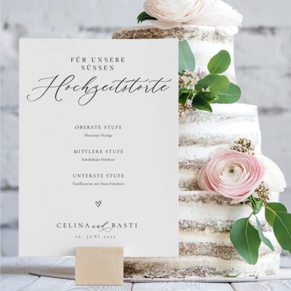Lasst eure Gäste mit diesem Schild wissen, welche Geschmacksrichtungen Sie mit den unterschiedlichen Stufen der Hochzeitstorte erhalten. Alternativ könnt ihr auch einen Hinweis ergänzen, dass die Torte vom Brautpaar angeschnitten wird.