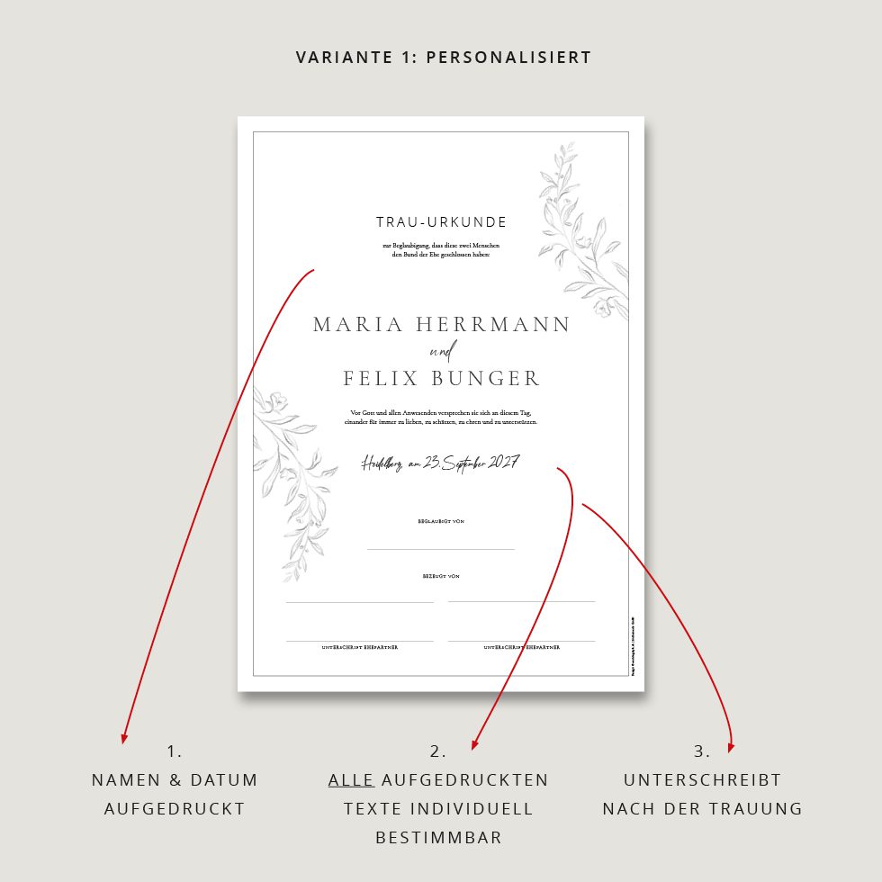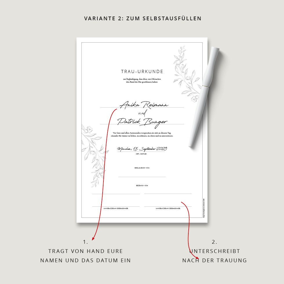 - Wir gestalten innerhalb von 1-2 Werktagen eure persönliche Trauurkunde und drucken sie auf feine Papiere.