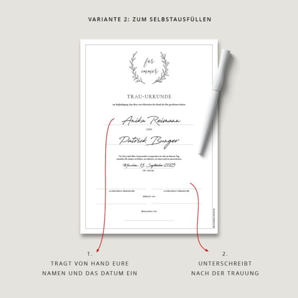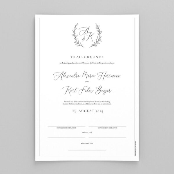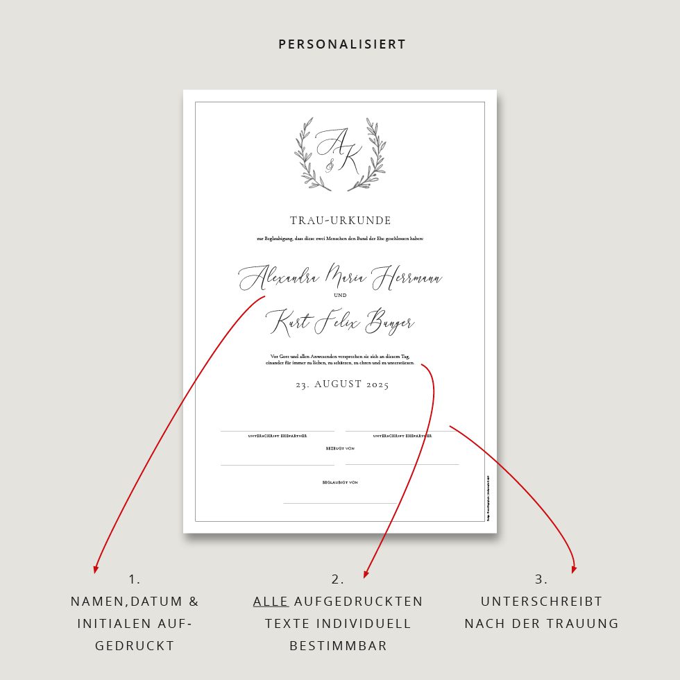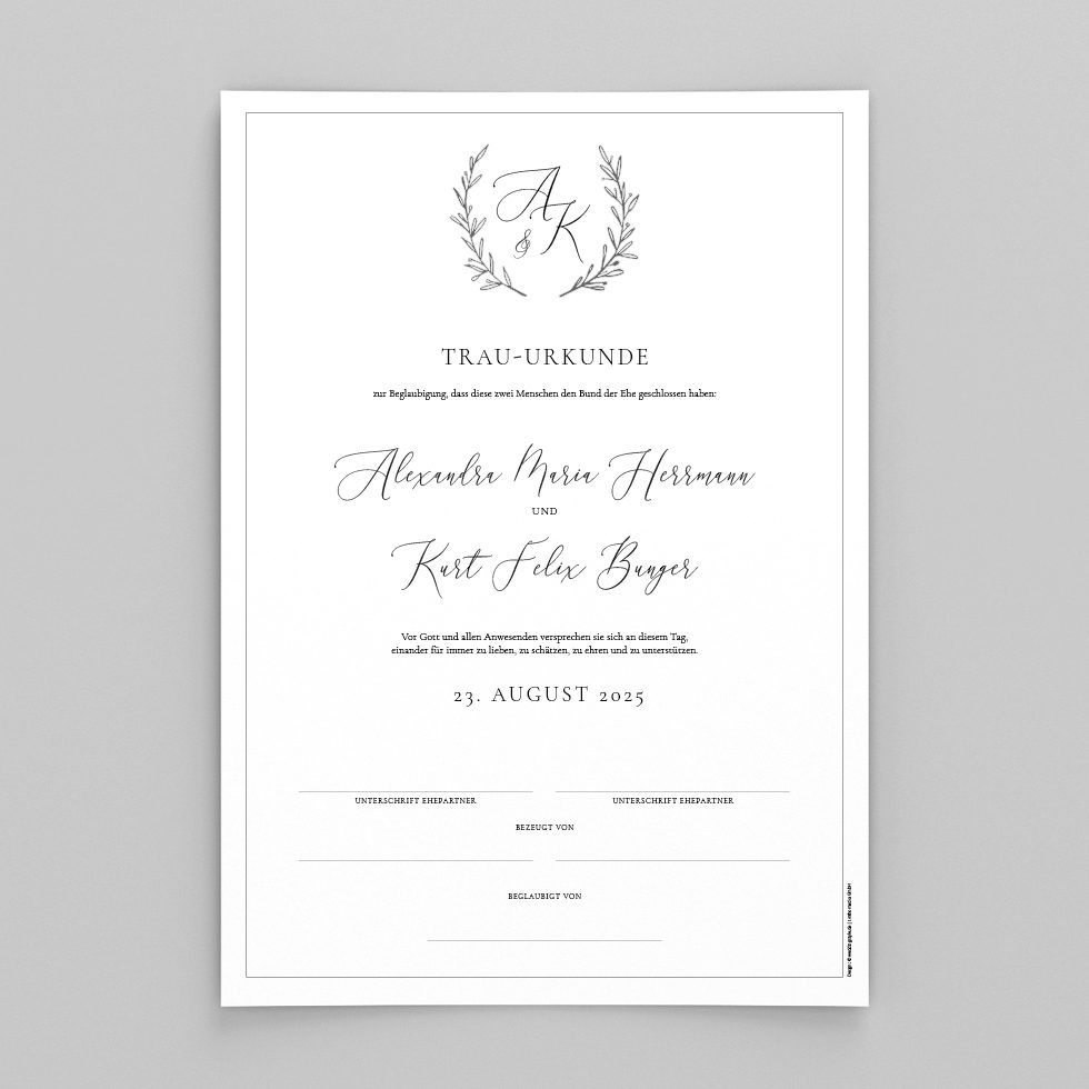 - Wir gestalten innerhalb von 1-2 Werktagen eure persönliche Trauurkunde und drucken sie auf feine Papiere.