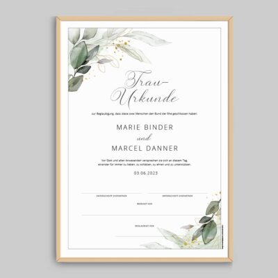 Unsere Trauurkunden sind deshalb mit viel Liebe so gestaltet, dass sie eine Erinnerung für die Ewigkeit sind, die ihr euch anschließend eingerahmt an einem Ehrenplatz aufhängen könnt.