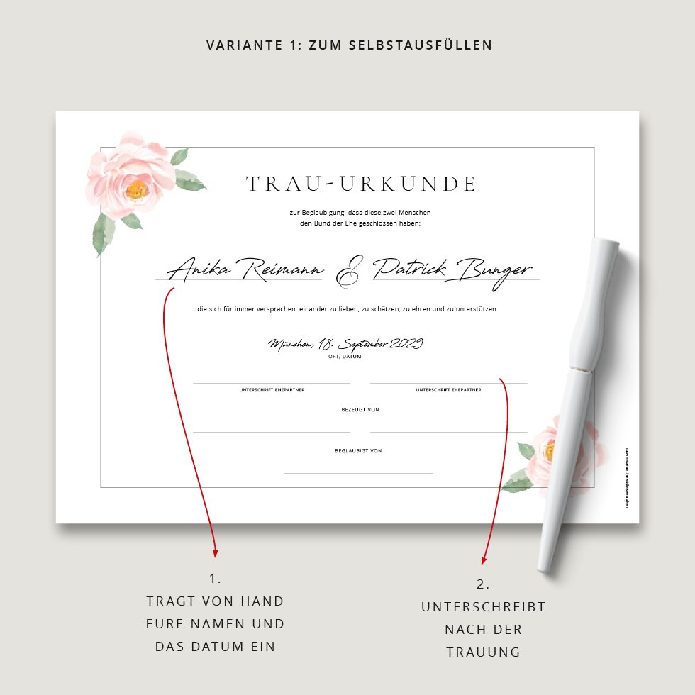 Deshalb ist das Unterzeichnen einer Hochzeitsurkunde wie ein abschließendes Trau-Ritual, das dieses Versprechen bei der standesamtlichen, kirchlichen oder freien Trauung zusätzlich besiegelt und für immer festhält.