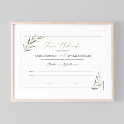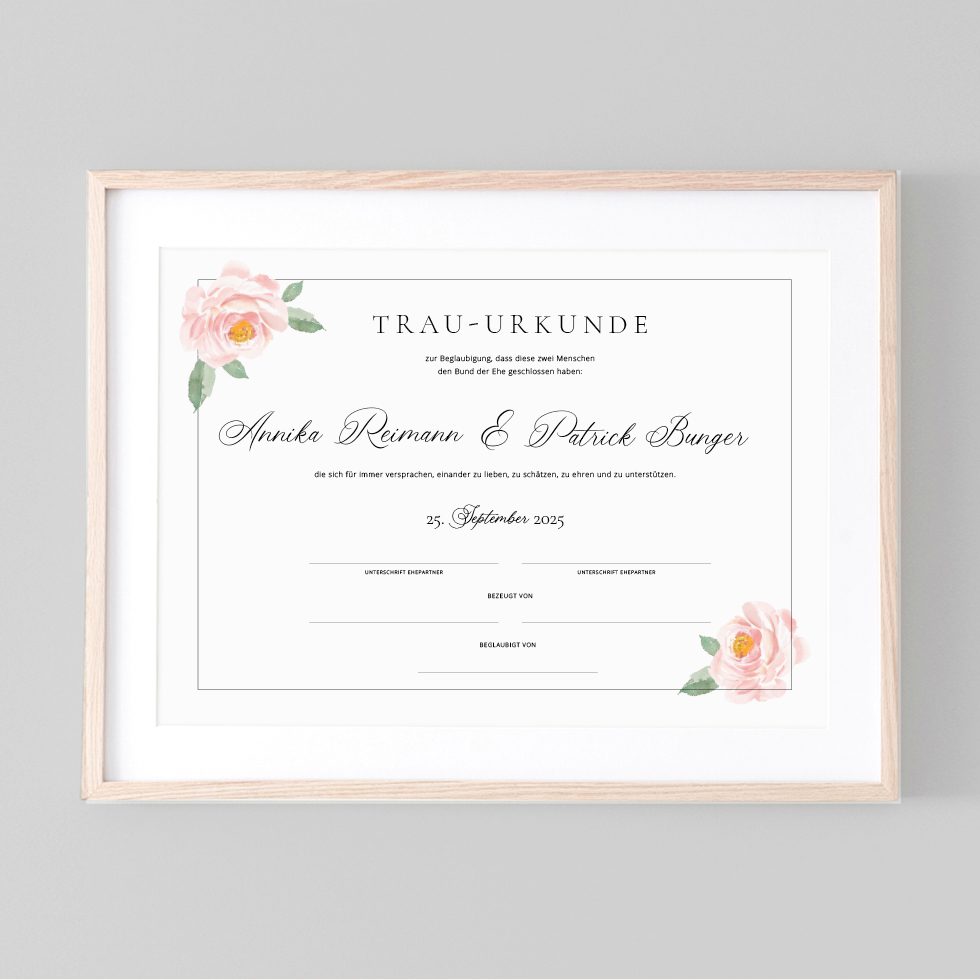 Unsere Trauurkunden sind deshalb mit viel Liebe so gestaltet, dass sie eine Erinnerung für die Ewigkeit sind, die ihr euch anschließend eingerahmt an einem Ehrenplatz aufhängen könnt.