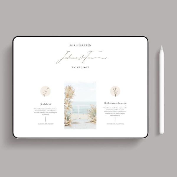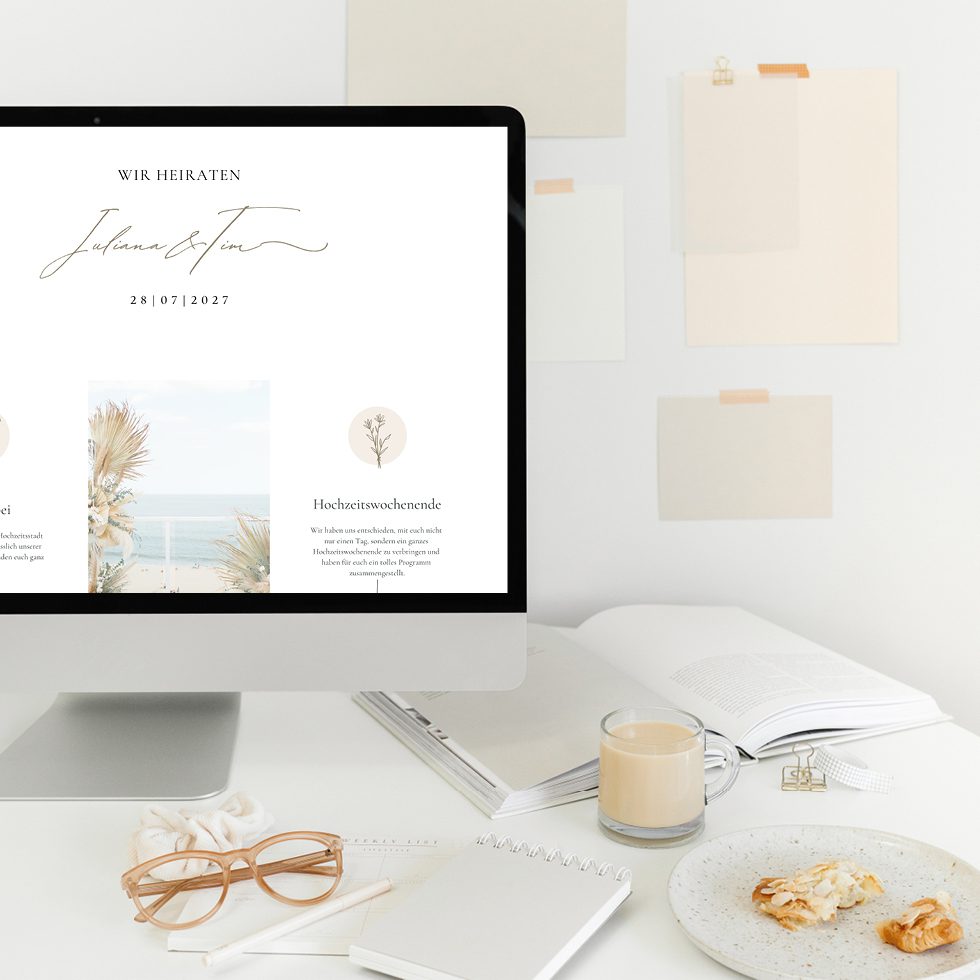 Gestaltet mit unserer cleveren Vorlage absolut einfach, frei und intuitiv in Canva eine wunderschöne persönliche Hochzeitswebseite.