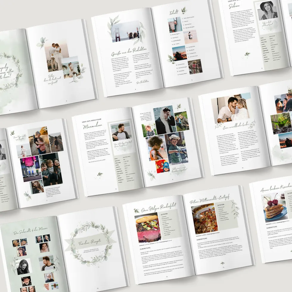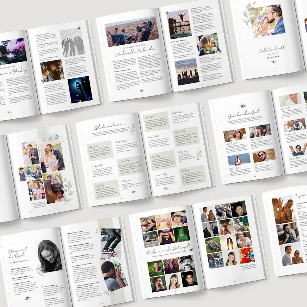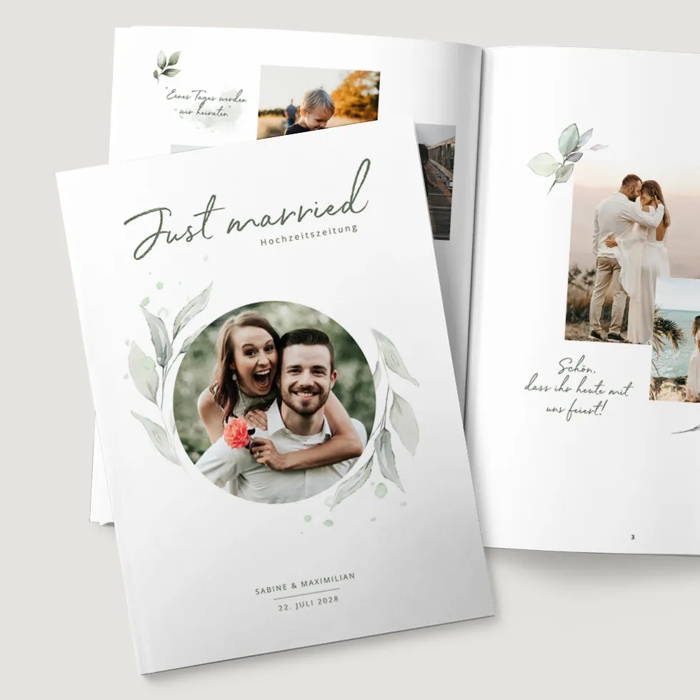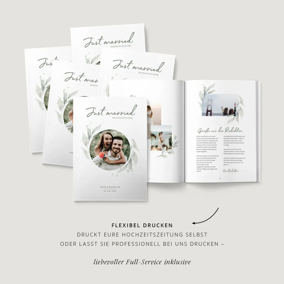 Gestaltet eure Hochzeitszeitung ganz nach euren Wünschen und erhaltet sie als PDF zum Selberdrucken oder hochwertig gedruckt.