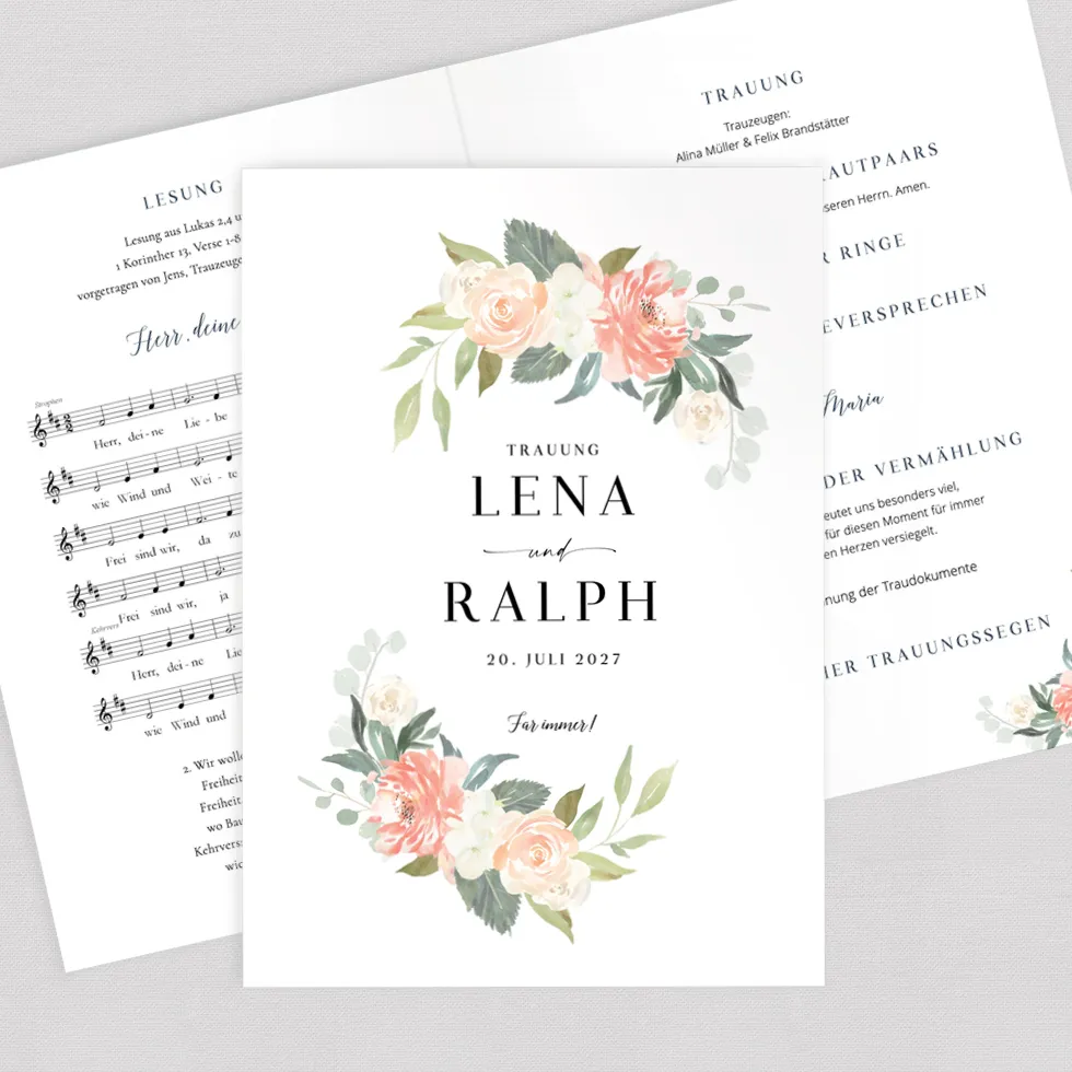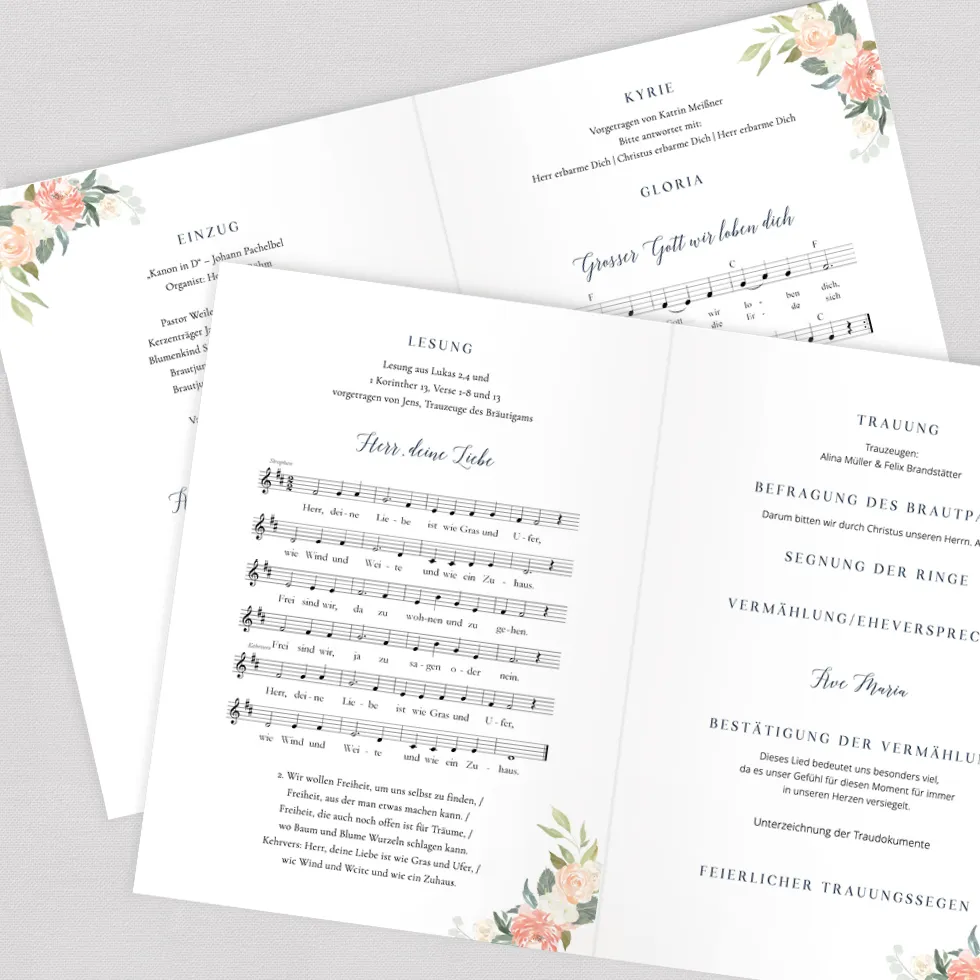 Gestaltet ein traumhaft schönes 12-seitiges Kirchenheft im Online-Konfigurator und erhaltet es als Vorlage zum Downloaden und Selberdrucken oder hochwertig gedruckt und geheftet.