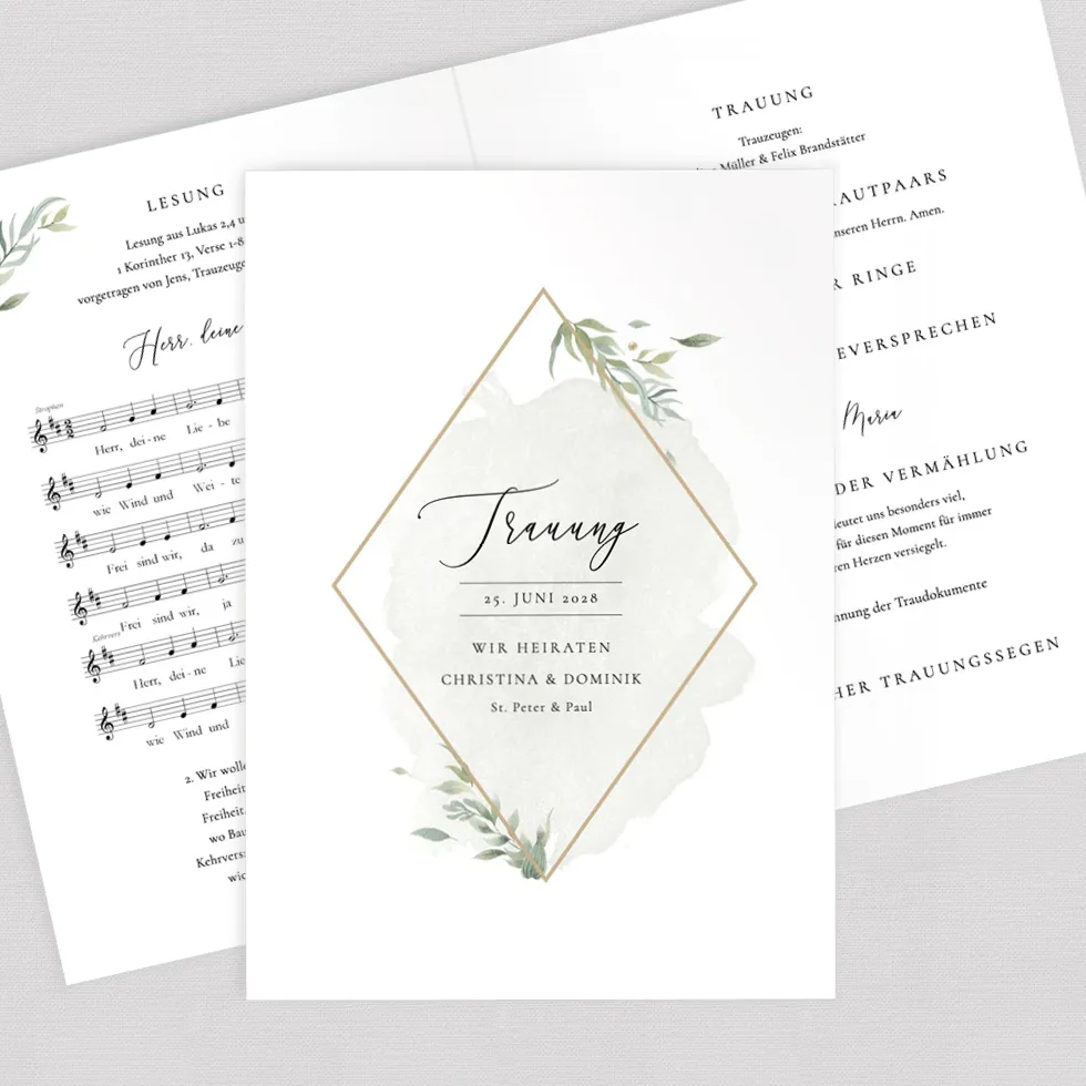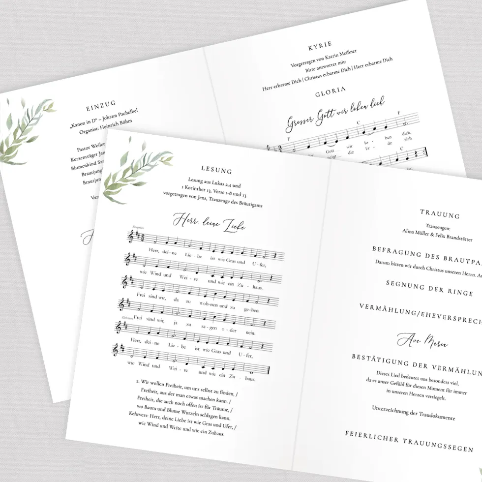 Gestaltet ein traumhaft schönes 12-seitiges Kirchenheft im Online-Konfigurator und erhaltet es als Vorlage zum Downloaden und Selberdrucken oder hochwertig gedruckt und geheftet.