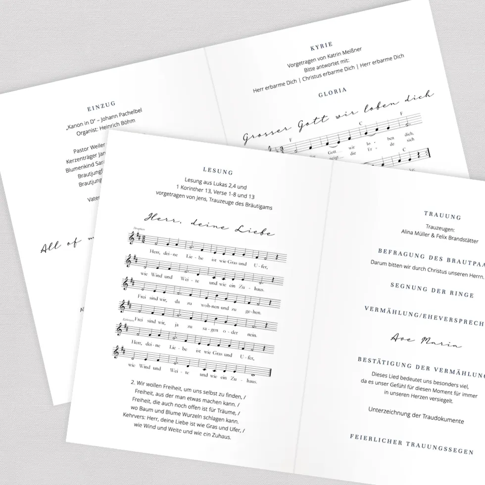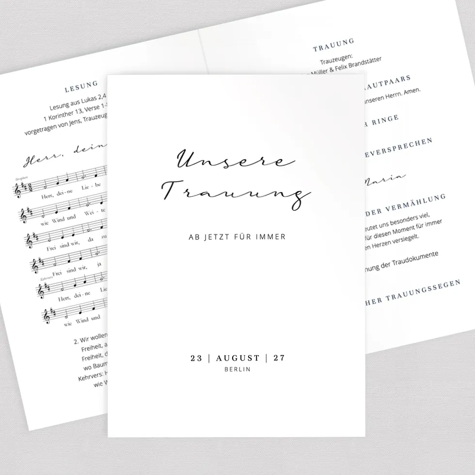 Gestaltet ein traumhaft schönes 12-seitiges Kirchenheft im Online-Konfigurator und erhaltet es als Vorlage zum Downloaden und Selberdrucken oder hochwertig gedruckt und geheftet.