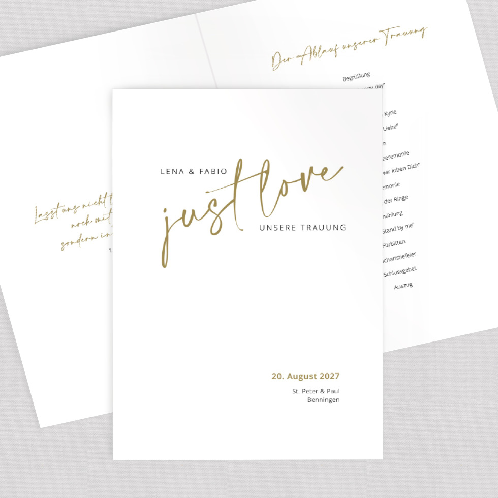 Gestaltet einen wunderschönen Kirchenheft Umschlag oder 4-seitiges Trauheft – zum Downloaden und Selberdrucken oder hochwertig auf besonderes Papier gedruckt.