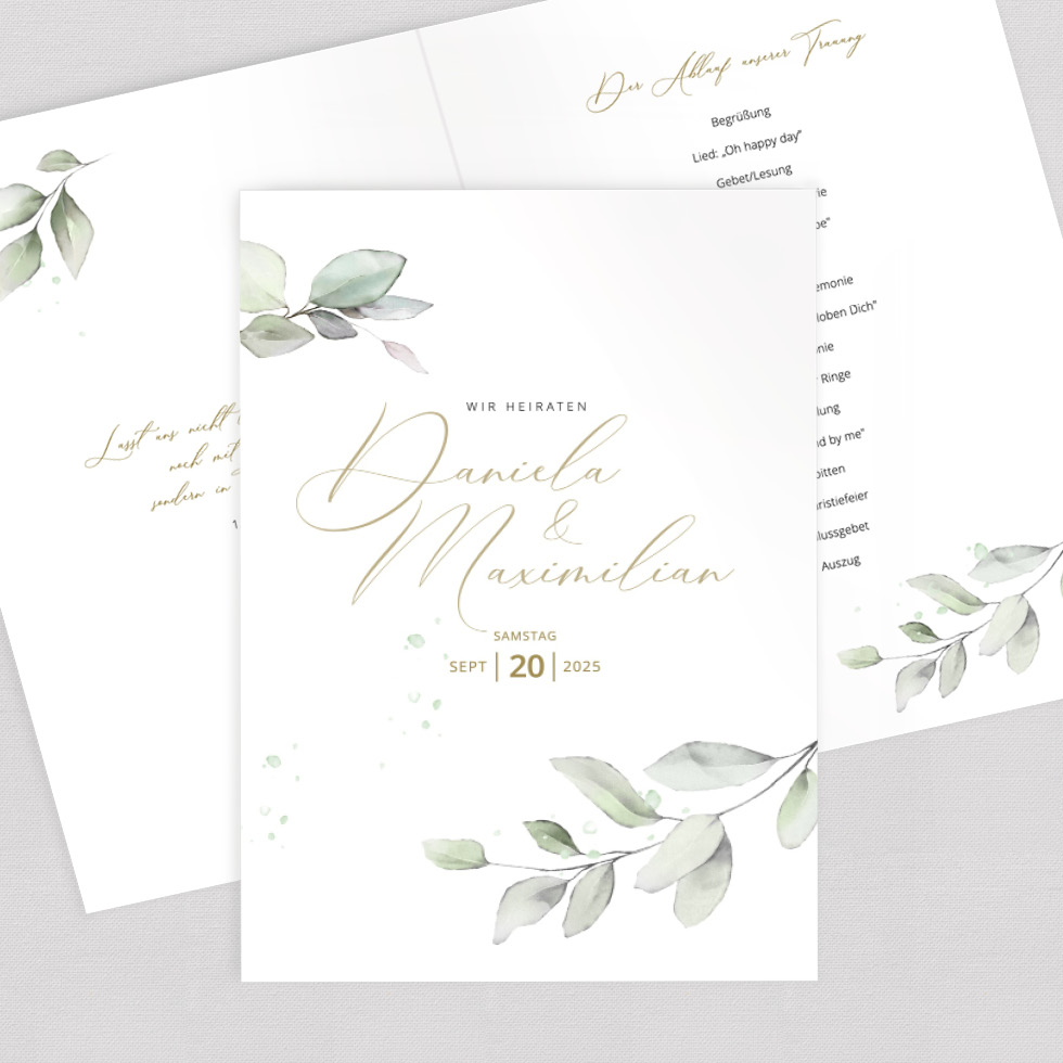 Erstellt euren individuelles Trauheft mit eurem Trauablauf auf der Innenseite oder nutzt den Umschlag, um ihn mit selbst gedruckten Einlegern zu ergänzen.