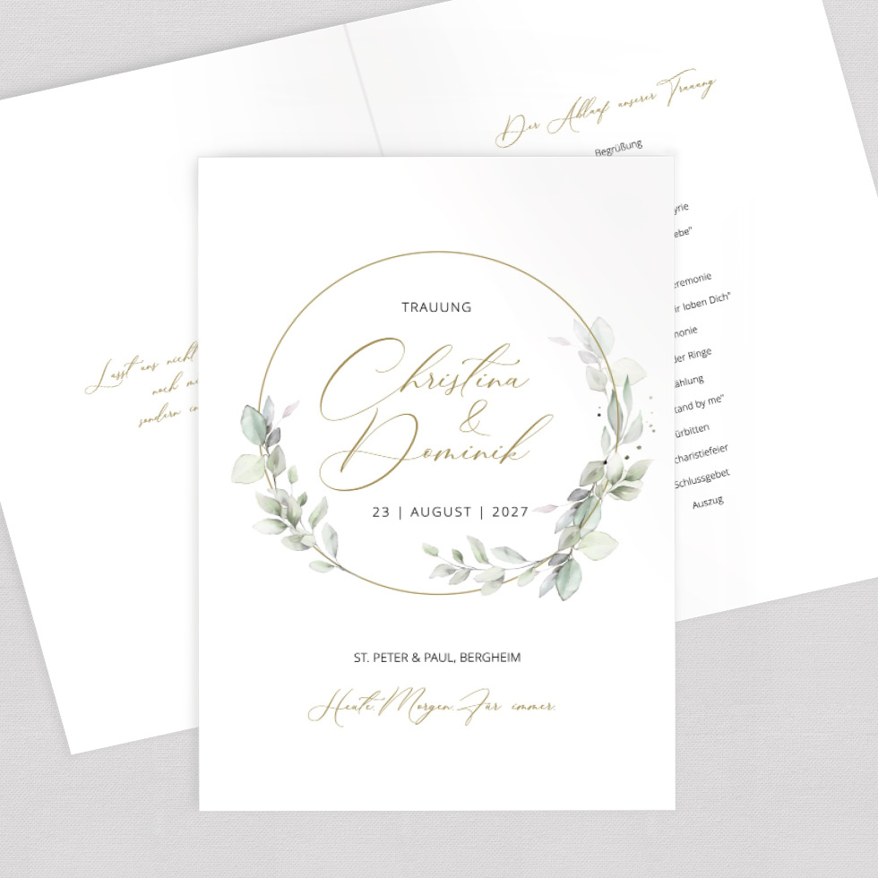 Gestaltet einen wunderschönen Kirchenheft Umschlag oder 4-seitiges Trauheft – zum Downloaden und Selberdrucken oder hochwertig auf besonderes Papier gedruckt.
