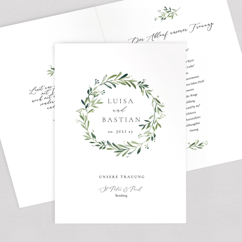 Gestaltet einen wunderschönen Kirchenheft Umschlag oder 4-seitiges Trauheft – zum Downloaden und Selberdrucken oder hochwertig auf besonderes Papier gedruckt.
