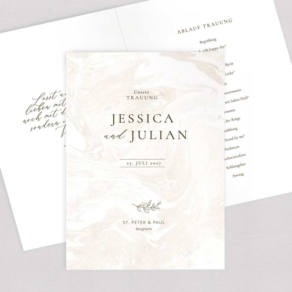 Gestaltet einen wunderschönen Kirchenheft Umschlag oder 4-seitiges Trauheft – zum Downloaden und Selberdrucken oder hochwertig auf besonderes Papier gedruckt.