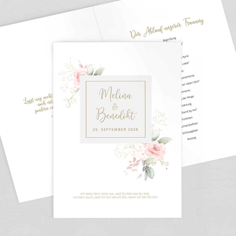 Gestaltet einen wunderschönen Kirchenheft Umschlag oder 4-seitiges Trauheft – zum Downloaden und Selberdrucken oder hochwertig auf besonderes Papier gedruckt.