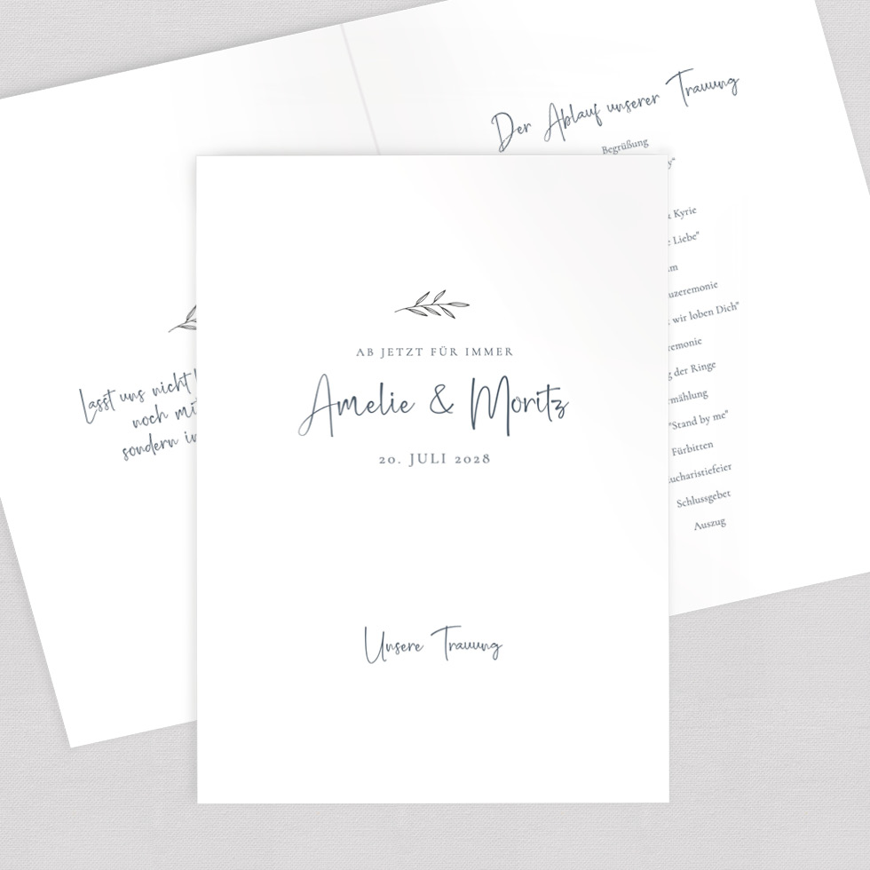 Gestaltet einen wunderschönen Kirchenheft Umschlag oder 4-seitiges Trauheft – zum Downloaden und Selberdrucken oder hochwertig auf besonderes Papier gedruckt.