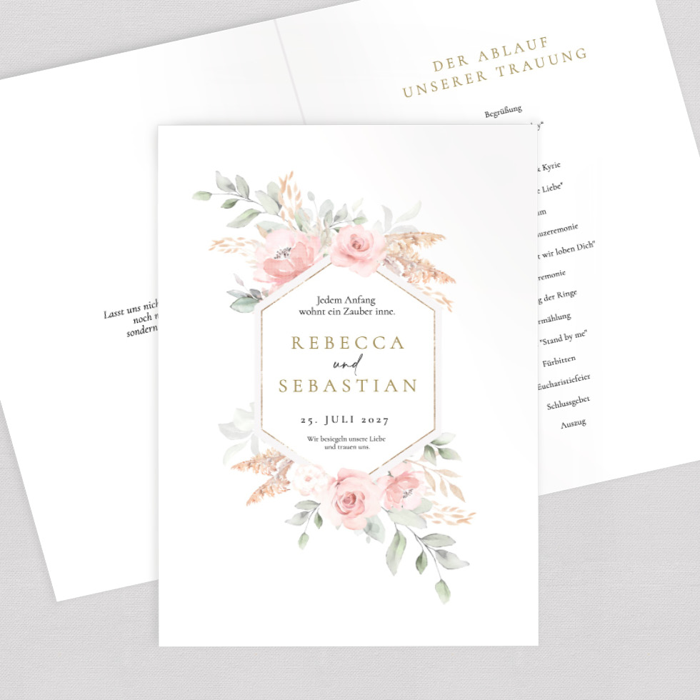 Gestaltet einen wunderschönen Kirchenheft Umschlag oder 4-seitiges Trauheft – zum Downloaden und Selberdrucken oder hochwertig auf besonderes Papier gedruckt.