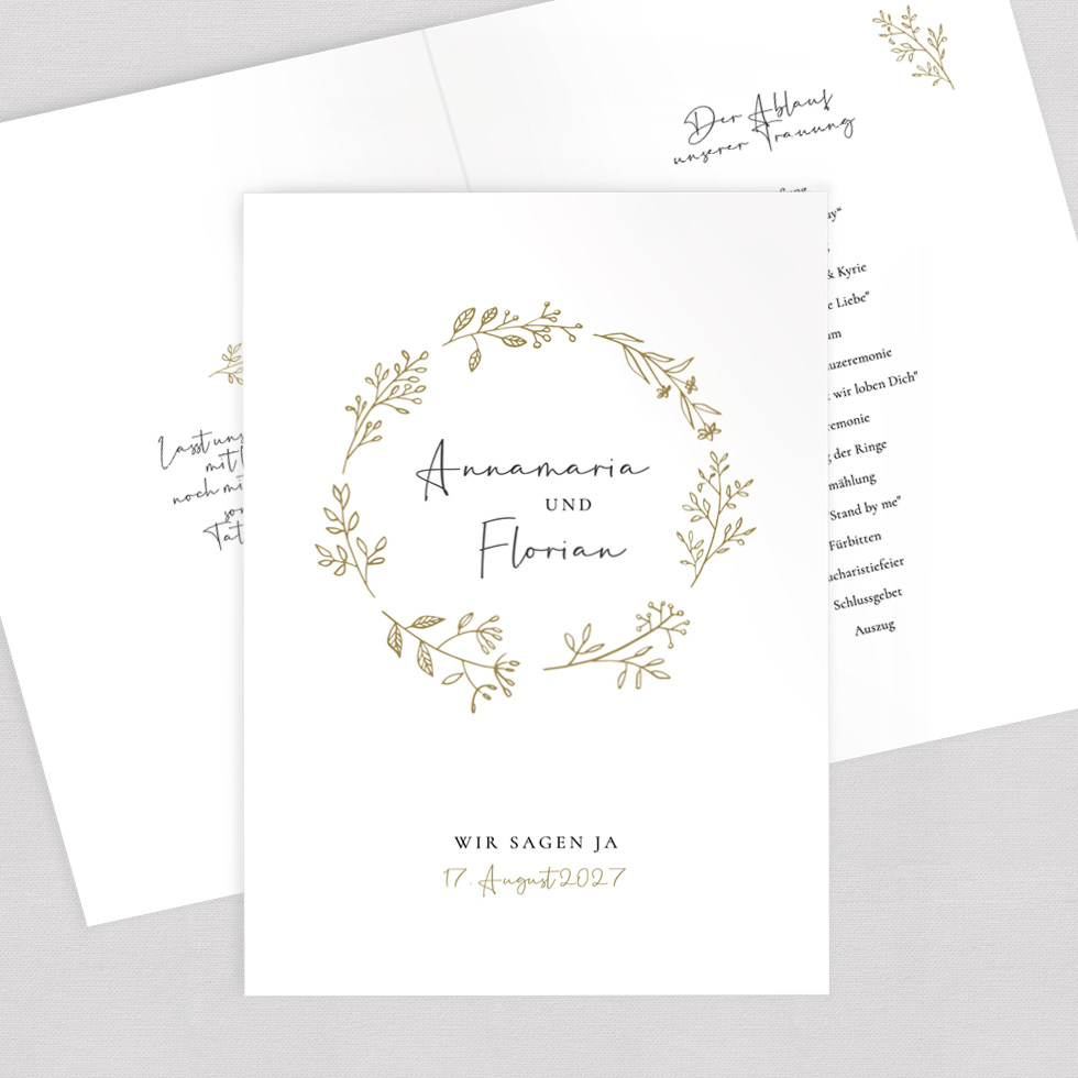 Gestaltet einen wunderschönen Kirchenheft Umschlag oder 4-seitiges Trauheft – zum Downloaden und Selberdrucken oder hochwertig auf besonderes Papier gedruckt.