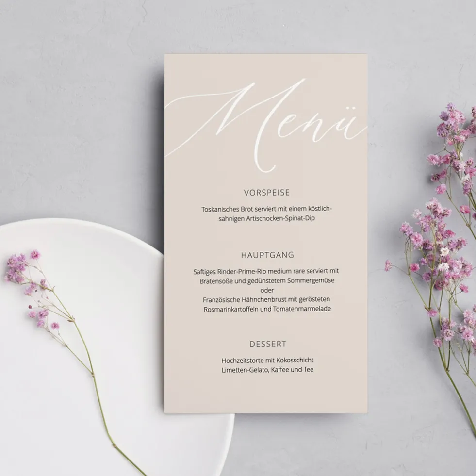 Gestaltet eure Menükarte absolut individuell und passend zu eurer Tischdeko: Alles ist frei veränderbar: Schrift, Farben, Hintergrund oder Ergänzung weiterer Elemente.