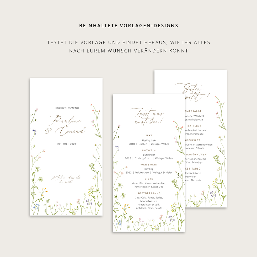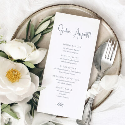 Gestaltet eure Menükarte absolut individuell und passend zu eurer Tischdeko: Alles ist frei veränderbar: Schrift, Farben, Hintergrund oder Ergänzung weiterer Elemente.