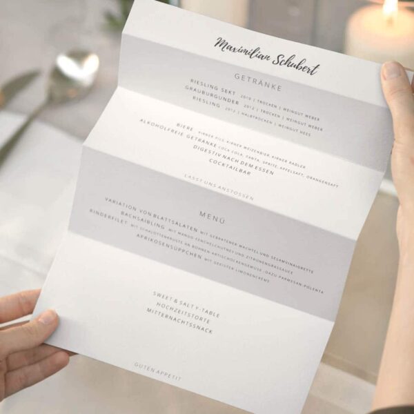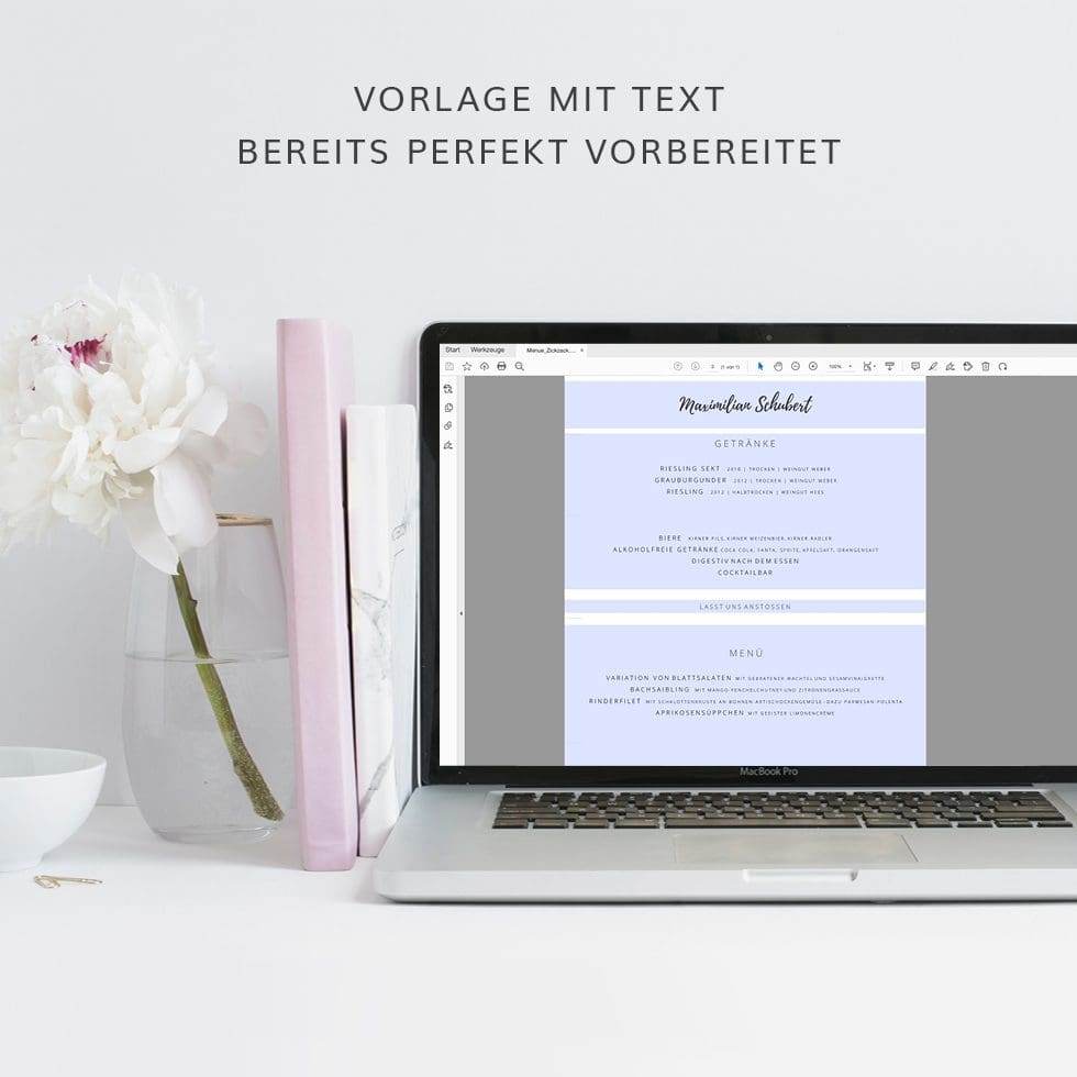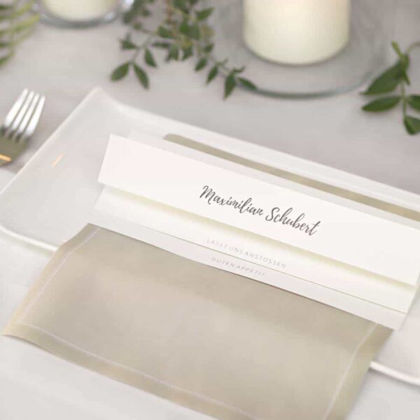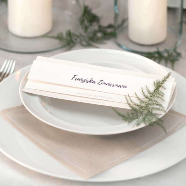 Die Menü- und Platzkarte könnt ihr ruckzuck mit eurem Menü beschriften und oberhalb sogar den Namen des Gastes oder einen Willkommens-Spruch ergänzen.