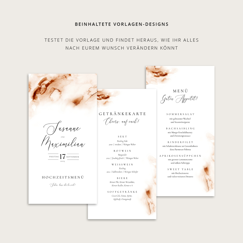 Gestaltet eure Menükarte absolut individuell und passend zu eurer Tischdeko: Alles ist frei veränderbar: Schrift, Farben, Hintergrund oder Ergänzung weiterer Elemente.