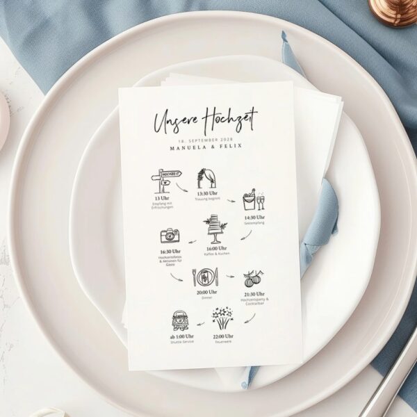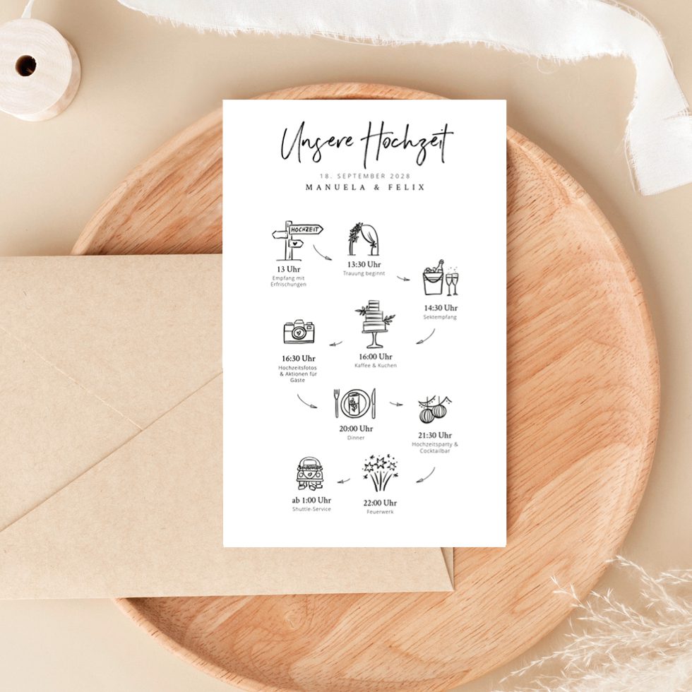 Gestaltet ganz individuelle Tagesablauf Karten ergänzend zur Einladung oder als Infokarte bei der Hochzeit.