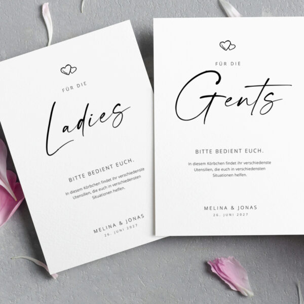 Gestaltet supereinfach tolle Notfallkörbchen Schilder für Damen und Herren bei eurer Hochzeit.