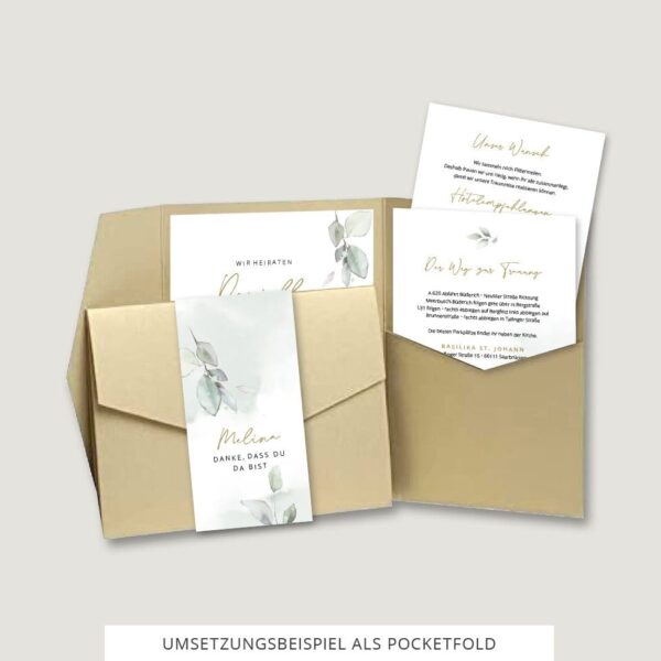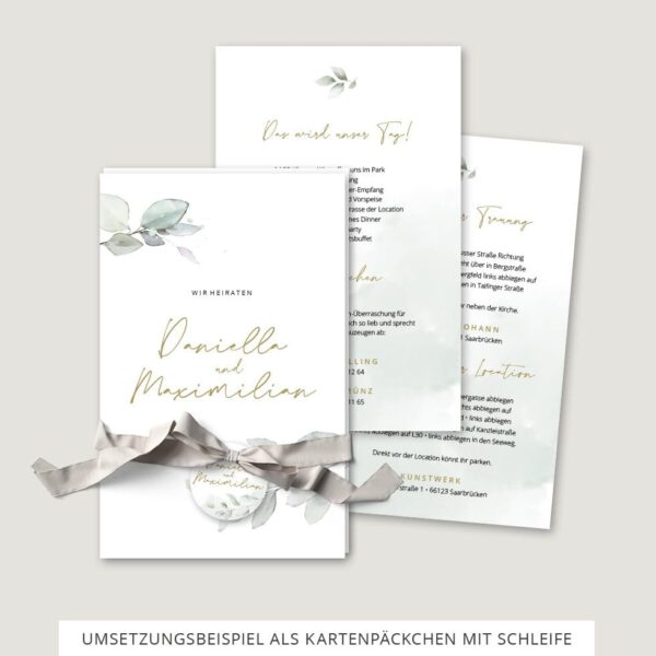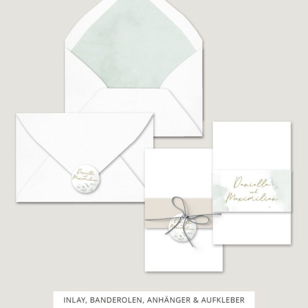 Von der Einladung über Accessoires für die Trauung und Feier bis hin zu den Dankeskarten ist alles beinhaltet.