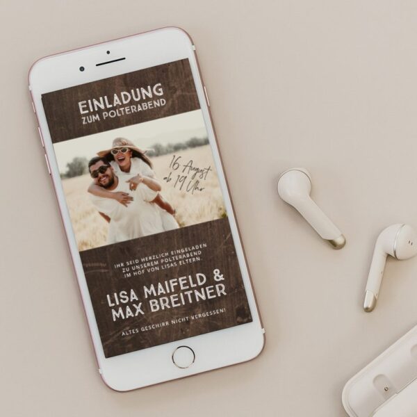 Gestaltet eure digitale Polterabend Einladung für WhatsApp oder E-Mail absolut individuell und ganz nach euren Wünschen: