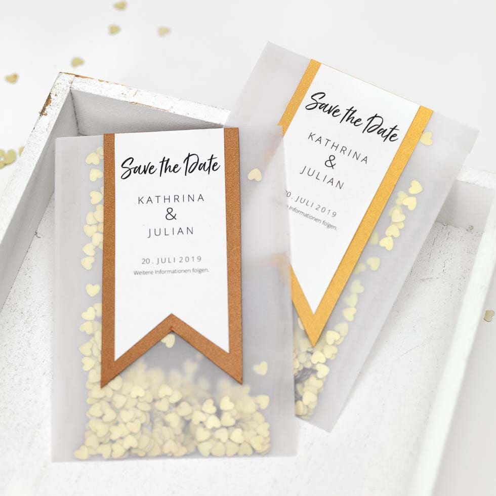 Wenn ihr eine richtig coole und außergewöhnliche Save the Date Karte sucht, ist diese genau richtig. Denn ihr könnt das Tütchen dieser Vorankündigung zur Hochzeit mit den unterschiedlichsten Ideen füllen: