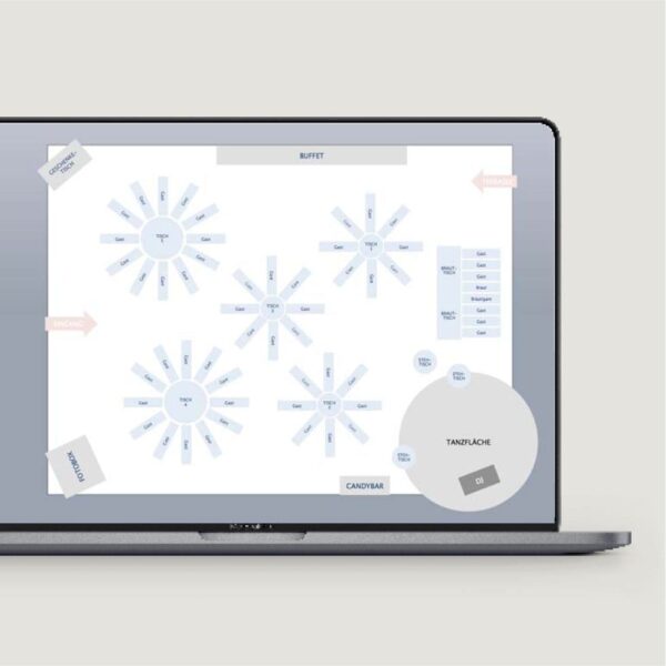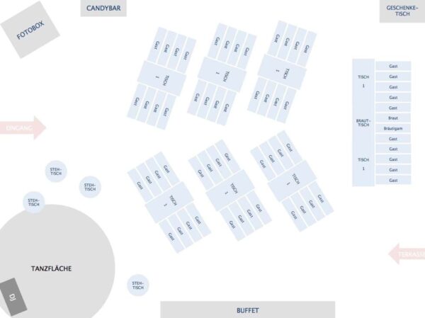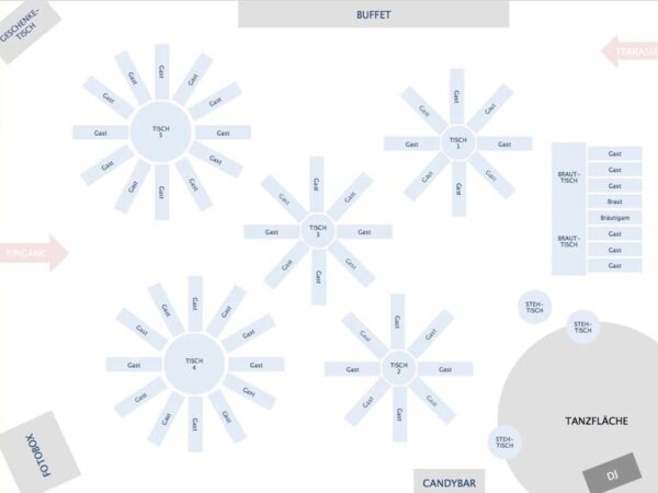 Zusätzlich ist es sinnvoll, sich zu überlegen, wo die Tanzfläche sein soll. Denn sie sollte auch als Aktionsfläche für Beiträge und Reden genutzt werden können und sollte deshalb von allen Gästen gut zu sehen sein – auch wenn sie alle an ihrem Platz sitzen.