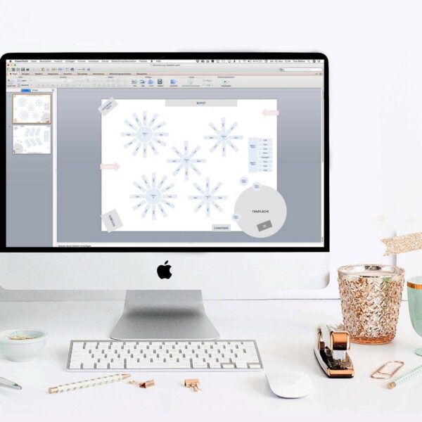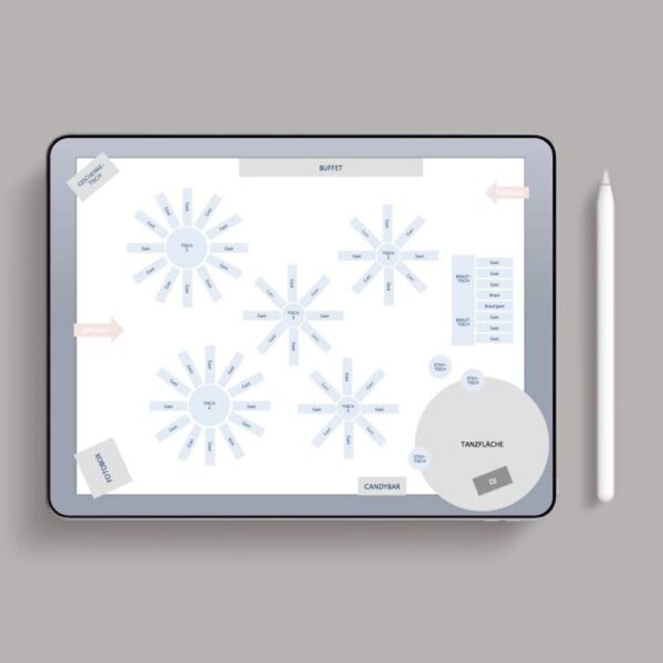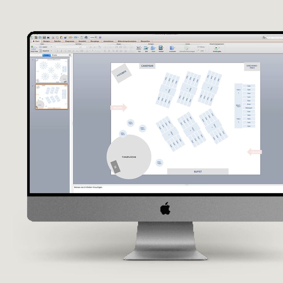 Zusätzlich könnt ihr eine schöne Überschrift gestalten, Logos ergänzen oder den Sitzplan mit verschiedenen Elementen richtig hübsch machen.