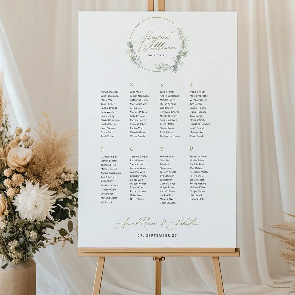 Gestaltet euren individuellen Sitzplan zur Hochzeit ganz nach euren Wünschen und erhaltet ihn als PDF zum Selberdrucken, Poster, stabile Platte, Leinwand, auf Acryl, oder als gerahmtes Bild.