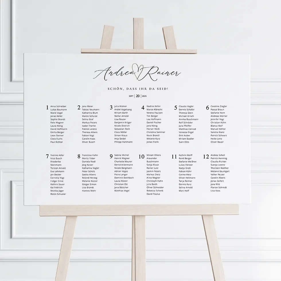 Gestaltet euren individuellen Sitzplan zur Hochzeit ganz nach euren Wünschen und erhaltet ihn als PDF zum Selberdrucken, Poster, stabile Platte, Leinwand, auf Acryl, oder als gerahmtes Bild.