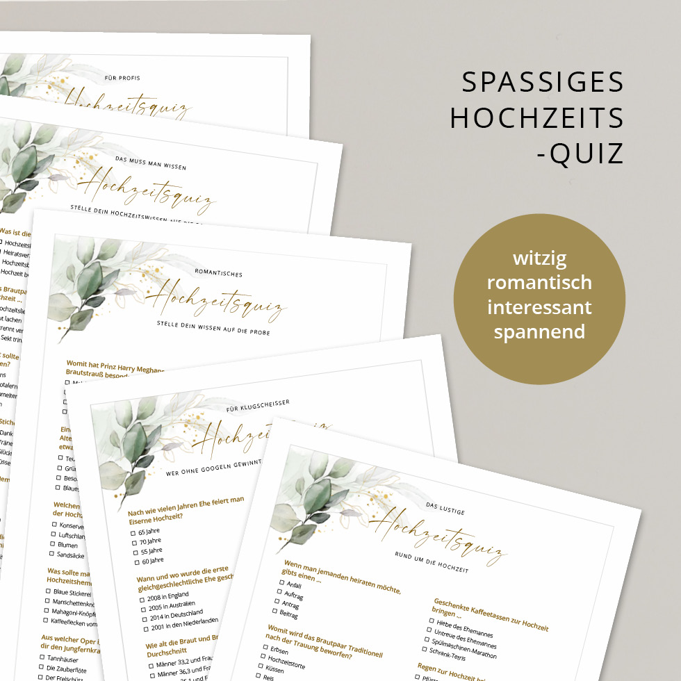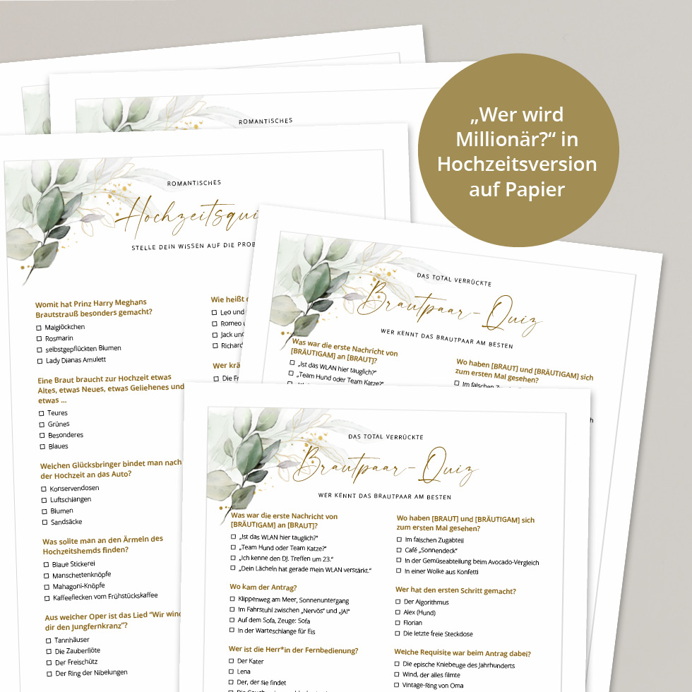 Ob Hochzeitsweisheiten und Basic-Hochzeitswissen (da hat jeder gleich eine Meinung) spannende Fragen (bei denen man überlegen muss) und extra-schwierige Fragen für echte Wer-wird-Millionär-Klugscheißer – in unseren Quizzen ist jeder mit Spaß dabei.
