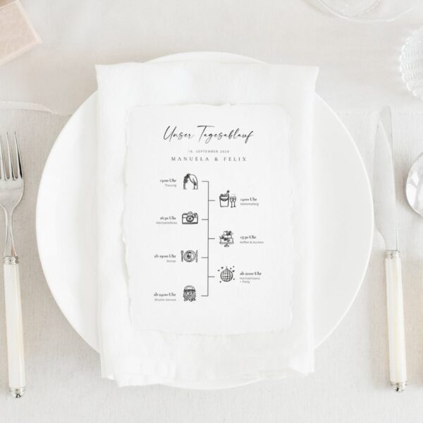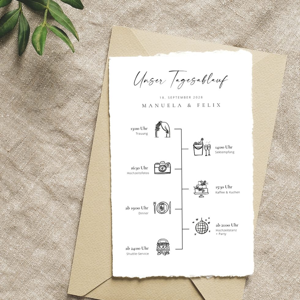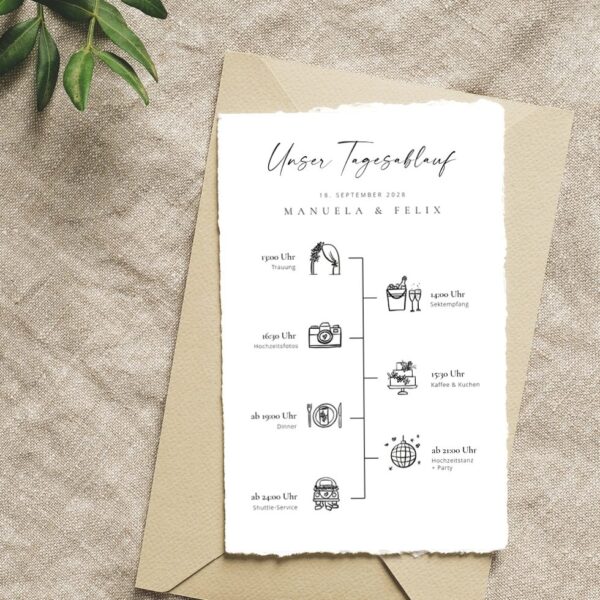 Gestaltet ganz individuelle Tagesablauf Karten ergänzend zur Einladung oder als Infokarte bei der Hochzeit.